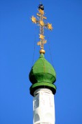 Кровля колокольни покрыта плоским жжёным кирпичом; впрочем, как видно из описи церковной, составленной в 1817 году, прежде сего она покрыта была листовым железом и окрашена зелёною медянкою. В верх от крыши выведен каменный осьмигранный шпиль с 40 сквозными пролётами, или круглыми окнами, в которых, во время пребывания здесь Войскового Правительства, при иллюминациях в высокоторжественные и прочие дни, ставилось до 450 плошек. Сверх шпиля находится посредственной величины глава, покрытая листовым железом и окрашенная зелёною краскою, увенчанная полумесяцем, над коим возносится древний, прекраснейшей работы железный крест [27], украшенный звёздами и вызолоченный червонным листовым золотом. Вышина колокольни от подошвы её до верхнего рога креста 64 арш. и 8 верш., а вокруг нижнего этажа 65 арш. и 4 вершка.