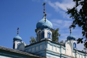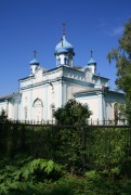 Кирпичная церковь Спаса Преображения в духе образцовых проектов, построенная в 1878 г. по проекту 1862 г. Приземистый пятиглавый четверик с прямоугольным алтарем, четырехстолпной трапезной и колокольней. Приделы Казанский (справа) и Александро-Невский (слева). Закрыта не позже 1930-х г., венчания сломаны, служила складом. В 1992 г. возвращена верующим, отремонтирована.