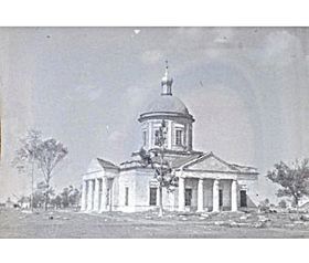 Кирпичная церковь, построенная в 1835-1840 гг. купцом И.С. Богдановым как кладбищенская, с 1858 г. приходская. Центрический однокупольный храм в стиле классицизма, отдельно стоящая колокольня построена в 1891-1894 гг. Боковые приделы Варваринский и Игнатия Богоносца. Закрыта в 1940 г., снесена в 1973 г.