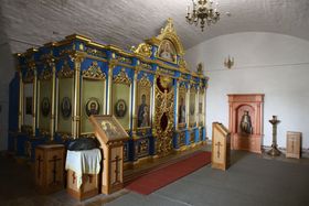 С южной стороны от царских врат находились икона Спасителя с припадающими прпп. Зосимой и Савватием, храмовая икона Рождества Пресвятой Богородицы, а за ней икона «Коронования Пресвятыя Богородицы и прп. Зосимы, Савватия, Германа и Иринарха Соловецких длиною 26 шириною 16 вершков, в средине ея вставлена икона: Пресвятыя Богородицы Тихвинския, на полях два Святых, длиною 54 вершков (около 23 см), на ней венец с прорезною короною и вся риза серебряные, золоченые, чеканной работы; убрус низан жемчугом мелким и средним со стеклами, в венце три, а на полях четыре хрусталя разноцветных в оправе, весу с украшением один фунт пятнадцать золотников.