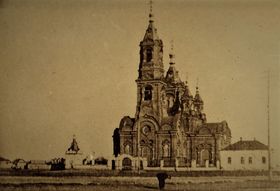 ... В 1896 году церковный староста В. В. Голованов, уже при настоятельстве иерея Василия Юнгерова, сына праведного Александра Чагринского, предложил в честь прошедшей коронации императора Николая II вместо деревянного здания храма возвести большую каменную церковь. Балаковский сельский сход вынес единодушный «приговор», давший согласие на строительство. Место для стройки размером в 700 кв. саженей было выделено на Хлебной (Троицкой) площади, с северной стороны прежнего деревянного здания церкви, недалеко от перекрестка Троицкой и Николаевской улиц (современные Урицкого и Коммунистическая). Предположительно каменный Троицкий храм, выполненный по типовому проекту самарского епархиального архитектора Т. С. Хилинского, находился в районе современного дома по адресу ул. Коммунистическая, д. 121 А.