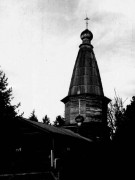 Внутри церкви сохранилось расписное небо. Стоит церковка среди поля, в куче елей и лиственниц на старом погосте: замшелые кресты, могильные камни, усыпанные хвоей и шишками... Рядом каменная церковь ХІХ века с классическим портиком, отчасти напоминающая каргопольскую церковь Зосимы и Савватия. Но рядом с деревянной каменная, даже неплохая по формам, всегда проигрывает. В дереве таится какое-то живое очарование. Возле деревянной церкви можно пробыть и час, и другой, и третий - и все так же она ненасытно радует глаз, и, возвращаясь полем на проезжую дорогу, все время будешь оглядываться и удивляться, как по мере удаления меняется ее силуэт, все более вытягиваясь и утончаясь, пока не мелькнет в последний раз за поворотом дороги…»