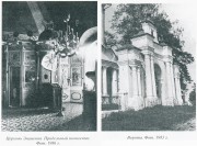 Дом священника - компактная постройка, по своим пропорциям и декору органично входящая в состав комплекса. Прямоугольный одноэтажный объем под вальмовой кровлей несколько вытянут по оси север-юг. Торцовый южный фасад с двумя широко расставленными окнами включен в линию ограды; его центральная ось подчеркнута чердачным окном с фронтоном. Прямоугольные окна с полочками под ними заключены в простые рамочные наличники с завершениями, напоминающими верхние окна храма. Ограда, окружающая церковный участок, характерна для подобных сооружений 1-й пол. 19 в. Ее основу составляют четырехгранные кирпичные оштукатуренные столбы с пологим четырехскатным завершением, связанные общим цоколем. В рисунке ажурной металлической решетки, укрепленной между столбами, использованы мотивы волют и спиралевидных завитков, объединяющих вертикальные копьевидные прутья. Ворота представляют собой трехмастное ступенчатое сооружение, увенчанное декоративным куполком с главкой. Наложенные на устои спаренные колонны разного масштаба на высоких постаментах фланкируют центральную и боковые арки (проезд и калитки) и поддерживают сильно раскрепованный антаблемент. В венчающей части также спаренные пилястры обрамляют киот с иконой.