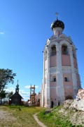 Нижний, глухой ярус являлся подклетом, в среднем, с узкими арочными окнами в гранях, находилась церковь, а в третьем, с открытыми арками, висели колокола. Ярусы последовательно сужаются кверху на величину завершающего каждый из них цоколя, как бы облегчая массы здания по мере их развития вверх. Углы столпа украшают обычные широкие лопатки, также суживающиеся по ширине в ярусах. А восьмерик звона внизу, под самыми арками, несет широкий пояс из поребрика, кирпичных балясин и нишек, т. е. характерный декор, сложившийся в XVI в. в местном зодчестве и хорошо известный по храмам Спасо-Прилуцкого монастыря.