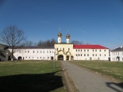 Двухпролетные Святые ворота с церковью Вознесения и приделом Феодора Стратилата. Входом на соборную площадь служат двухпролетные Святые ворота с надвратной церковью Вознесения. Они расположены по оси Успенского собора между западными келейными корпусами. Это третья по времени каменная постройка монастыря (1591—1593 гг.).