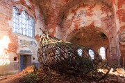 В интерьере господствует высокое центральное пространство. Переход от четверика к перекрытому куполом барабану осуществляется с помощью парусов. Интересен сужающийся кверху нижний ярус барабана, украшенный аркатурой. Ощущение простора и насыщенности светом усиливается благодаря преобладанию верхних источников света - трехчастных окон над входами и арочных окон в барабане центрального купола. Невысокий, вероятно мраморный иконостас (не сохр.) позволял воспринять пространство храма и апсиды как единое целое. Окна апсиды - единственный источник нижнего света в храме. Контраст между устремленным вверх пространством храма и более низкими помещениями апсиды и трапезной подчеркнут и формой их перекрытия. В барабане купола, парусах, в широких подпружных арках, образующих одновременно перекрытия ветвей внутреннего креста, инертные, глухие поверхности сведены к минимуму; в трапезной, перекрытой коробовым сводом без распалубок, и в полусферическом своде апсиды они преобладают. Затесненное узкое центральное помещение в нижнем ярусе колокольни, ведущее в трапезную, также перекрыто коробовым сводом. Мощные стены изолируют от него боковые ячейки: с юга - ризницу (вход из трапезной), а с севера - помещение с лестницами наверх и в подвал (вход с северного фасада). В подвале под трапезной находились обогревавшие церковь калориферы. Низкий свод подвала — железобетонный, гофрированный, на двутавровых балках - опирается на квадратные столбы небольшого сечения. Окна подвала напоминают бойницы.