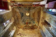 Внутри четверик перекрыт высоким восьмилотковым сводом с узкими диагональными гранями, прорезанным световым барабанчиком. Угловые тромпы имеют оригинальную конструкцию: маленький тромп служит опорой для трапеции, наклоненной внутрь храма. В стенах апсиды, перекрытой коробовым сводом с граненым восточном лотком, сохранились узкие маленькие ниши дымохода и сдвоенные узкие печуры со щипцовыми завершениями. Полы двустолпной трапезной с пересекающимися коробовыми сводами выстланы квадратными чугунными плитами, у западной стены - белые кафельные печи с иониками в карнизе. Из трапезной в нижний ярус колокольни ведут богато орнаментированные двустворчатые двери с веерной расстекловкой верхней полуциркульной части.