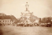 Снаружи церкви, на фронтоне, была небольшая мансарда с окном, наполовину закрытым металлической оградой. На башне возвышалась небольшая, обитая жестью, пирамида с железным крестом. На мансарде с двух сторон от башни стояли три деревянные статуи в рост человека - апостолов Петра и Павла и пророка Моисея. Мансарду украшали четыре деревянных резных цветника, а немного выше размещались четыре деревянных образа ангелов, которые держали кресты.