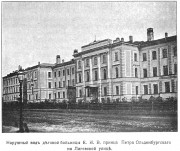 Когда принц Петр Георгиевич Ольденбургский прослужил в благотворительном ведомстве Учреждений Императрицы Марии четверть века, ведомство решило отметить этот юбилей основанием в столице детской больницы его имени. В это время в России действовало всего три больницы для детей. Постройка здания продолжалась ровно три года: 30 сентября 1866 больница была заложена и 30 сентября 1869 освящена митрополитом Исидором в присутствии принца Ольденбургского с семьей. Работы велись по проекту Ц. А. Кавоса, который в марте 1866 выиграл объявленный конкурс, и под руководством комиссии, куда входил известный педиатр К. А. Раухфус, стремившийся сделать больницу „образцовым учреждением в своем роде“. На строительство и оборудование пошло почти 700 тыс. руб. На Всемирной выставке в Париже в 1878 больницу наградили большой золотой медалью, и тогда же она получила имя принца Ольденбургского.