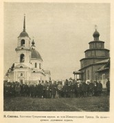 Храм освящен в 1748 г. с приделом во имя свт. Николая. В резном шестиярусном иконостасе находилось 106 икон XV-XVIII вв. Значительно перестроен в 1890-93 гг. Вот описание внешнего вида, о котором теперь можно только догадываться. В основе главной части храма лежит четверик, несущий слегка уменьшающиеся по высоте и резко, заметно по ширине три восьмерика. Четвертый восьмерик-шейка, венчаемая восьмигранной главкой и крестом. С востока к основному объему примыкает традиционный пятистенный алтарь под пологой пятискатной крышей. Западная часть, которую условно можно назвать папертью, поскольку к этому времени трапезные, как особые, отделенные от храма помещения, теряют свое функциональное значение. Сделанная на сужение в три стены, а с боковыми стенами центрального сруба - в пять стен, как алтарь, она, возможно, была вовсе и не папертью, а развивала на западную сторону помещение для молящихся.