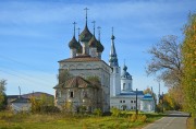 Расположен в самой высокой части села, на пересечении его основных улиц - Ивановской и Красноармейской и ориентирован вдоль последней. Формирование комплекса началось в нач. 18 в. строительством церкви Троицы. Вскоре на ее продольной оси, немного западнее, возвели отдельно стоящую колокольню, а в 1808 г. на той же общей оси комплекс дополнила церковь Рождества Богородицы, построенная на средства крестьянки села А.Д. Ледневой по проекту С.А. Воротилова, почти повторившего свой Богоявленский собор в Костроме. Позднее к западному фасаду этого храма был пристроен новый притвор. К северу от комплекса раскинулась торговая площадь (ныне Советская), к которой позже была проложена одна из главных улиц села. Западную сторону этой улицы закрепили вытянувшиеся вдоль нее торговые ряды нач. 19 в., включившие в себя первый ярус колокольни, а на восточной стороне, перед Троицкой церковью, поставили две часовни (нач. 19 в.).