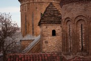 Сейчас храм — совершенно классический крестово-купольный храм с двумя опорными колоннами. Необычно то, что он сложен из камня, а не из кирпича. Это наверное единственный храм Грузии XVII века, построенный таким образом. Вся страна давно перешла на кирпич, и только эти строители решили строить так, как в древности. Это же касается и каменной резьбы. Её часто описывают в путеводителях как что-то выдающееся, упуская из виду, что таких вещей не делали уже лет 300. Грузинская каменная резьба вымерла где-то в монгольскую эпоху, но здесь решили воспроизвести и резные виноградные листья и гроздья. Вот .например, портал храма. Это совершенно персидская по форме арка, но её украсили орнаментами в стиле XII века. Даже виноградные гроздья сделали.