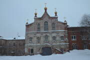Импозантное масштабное сооружение, состоящее из разновеликих объемов, играет активную роль в организации монастырского ансамбля и городской площади. Ради выразительности силуэтов двухэтажные прямоугольные в плане корпуса на подвалах, соединенные под углом, по оси фасадов обогащены трехэтажными ризалитами. Средняя часть северного крыла здания увенчана фигурным фронтоном, представляющим эффектную композицию из трех арочных дуг. Введение сложных фигурных завершений продиктовано градостроительными соображениями.