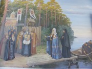 На правой половине святых ворот изображен первый основатель сей обители, преподобный Арсений, а над главою его - Коневская Божия Матерь с парящим вокруг ее сонмом ангелов; на левой половине изображен Святитель Евфимий II, архиепископ Новгородский, первый Владыка, посетивший преподобного Арсения по вселении его на острове Коневце; над главою его нерукотворенный образ Христа Спасителя в сонме ангелов; в самом же верху, в полуциркуле, Господь Бог Саваоф нисходящим от него Духом Святым в виде голубя.