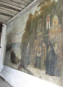 В основании колокольни и святых ворот направо помещается кладовая с погребом внизу для хранения огородных продуктов, налево - общая келья для звонаря и привратника. Вся же с этой стороны постройка: колокольня, Святые ворота и от них два корпуса правый и левый - вместе взятые составляет западную сторону всего монастырского здания.