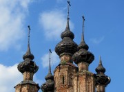 Собственно храм — расчлененный карнизом на два яруса бесстолпный двусветный четверик с окнами, размешенными по трем осям, — завершен четырехскатной крышей, увенчанной пятиглавием. Фигурные, сравнительно редкой формы деревянные главы поставлены на двухъярусные граненые барабаны. С востока к храму примыкает пониженный более узкий прямоугольный в плане алтарь со скругленным выступом восточной стены, с запада — небольшая компактная трапезная. Композицию замыкает трехъярусная колокольня.