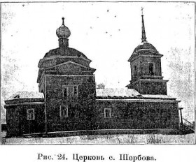 Построен он самими прихожанами, к сожалению, неизвестно когда. Первые точные сведения о нем почерпаются из описи церковного имущества от 1808 г., из которой видно, что уже в этом году он подвергался значительному ремонту. Храм деревянный, холодный, маловместительный, к тому же отстоит от села более чем на версту. В 1891 г. образован Комитет по сооружению нового каменного храма. В период времени 1877-85 гг. Щербовский приход был приписным к селу Пальне.