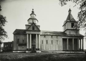 Старая западная граница бабинца отмечена в интерьере остатками западной грани в виде заплечиков. Внутри бабинца и притвора расставлено в два ряда шесть колонн, поддерживающих сволоки, на которые наслан помост хоров и придела. От центрального участка хоры отделяет перегородка из балясин. Перекрыты хоры Коробовым сводом. Обмерные чертежи плана погибли, и сохранился лишь обмерный чертеж продольного разреза. Схему плана срубов стен, Основные размеры восьмерика и фонаря мы реконструировали на основе чертежа разреза и анализа внутреннего вида верха церкви, сфотографированного в ортогональной проекции. При этом мы исходили из предписаний, по которым строились формы других обмеренных нами сооружений Левобережья. Реконструкция плана и обмерные чертежи разреза и стали основой для анализа архитектурных форм памятника.