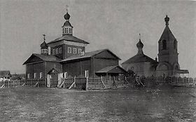 Деревянная Воскресенская церковь была основана в 1744 г. Стоит на ровном месте. В 1876 г. с северной стороны был пристроен придел. Алтарь церкви с одним полукружием. В высоту он 9 сажень, длину 11 и ширину 4. Снаружи обита тесом. Кровля шатровая на два ската, крашена. Фонарь глухой и сквозной устроен над сводами, без украшений. Глава одна над церковью, другая над пределом обе окрашены. Окна узкие продолговатые, четырехугольные. В алтаре 2 окна. Окна с прямыми перемычками. Решетки железные. Всего в храме 13 дверей. Восемь из крыльца на паперть, в трапезную церковь, в алтарь двои (две). В придел двои и в ризницу двери деревянные без украшений. Внутреннее устройство храма в виде квадратной палаты. Алтарь от церкви отделяется деревянною стеною с двумя дверями, придел один в виде палаты, отделенной от церкви двумя пролета. Своды крестовые на столбах. Два столба круглые и гладкие, кругом их лавки деревянные. В алтаре, храме и притворах пол одинаковый деревянный. Алтарь трехчастный, разделенный тремя поперечными стенками. В южном пределе алтаря – ризница, а в северном придел. Престол деревянный шириною – 1 аршин, 5 вершков, шириною – 1 аршин, 8 вершков и высотою столько же. Сень – деревянная доска в длину и ширину придела. Жертвенник в одном отделении с престолом, на открытом месте – деревянный. Вышина – 1 аршин, 4 вершка и шириною 1 аршин. Иконостас деревянный, трехъярусный. Царские врата (резные ?) с Благовещением Девы Марии и Евангелистами. Иконостас без всяких украшений. Солея выше на одну ступень от пола, деревянная, решеткой не отделена. Клирос топорной работы без украшений. Колокольня построена в 1750 г., шатровая, неизвестно кем построена.