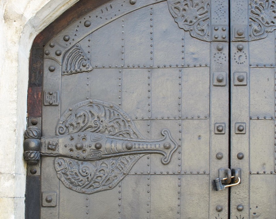 Собор Покрова Преподобной Богородицы.Накладная петля кузнечной работы на дверях северного притвора.