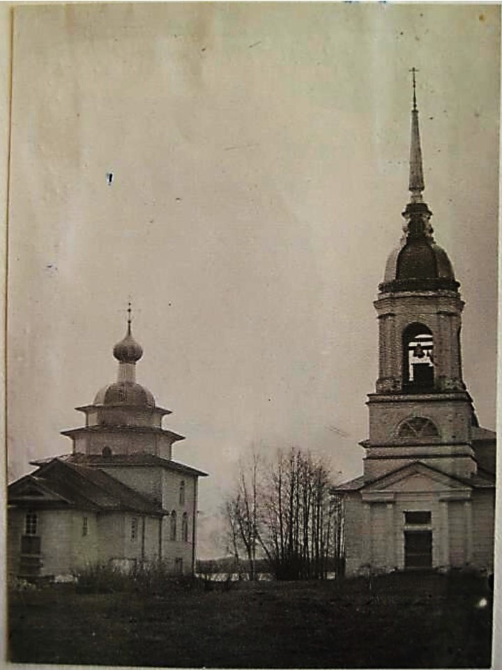Деревянная Происхожденская и каменная Богоявленская церкви. Общий вид с юго-запада. Фото 1927 г. из коллекции ГНИМА. (ГК № 9212589)
